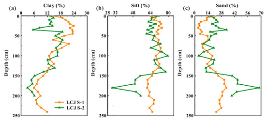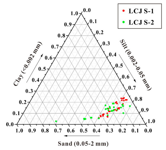 According to the American soil classification system, all soil particles could be classified into clay (<0.002 mm), silt (0.002–0.05 mm) and sand (>0.05 mm). The average percentages of these components were 15%, 68% and 17% in LCJ S-1, 12%, 63% and 25% in LCJ S-2, respectively (Table 2). The CV values (Coefficient of variation) of clay and sand percentages were much higher than those of silt percentages (Table 2), suggesting that the variation degree of clay and sand was much higher than that of silt in the two soil profiles. According to the percentages of clay, silt and sand (Figure 4), nearly all soil samples could be categorized as silty loam, indicating that most soil samples in the soil profiles were rich in silt.