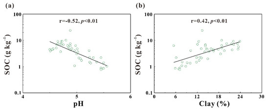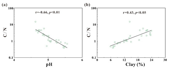 As shown in Figure 7, soil pH was significantly negatively correlated with SOC contents (r = −0.52, p < 0.01), indicating that relatively lower soil pH values might benefit the accumulation of SOC in the two soil profiles. According to the correlation between soil pH and soil C/N ratio, one potential mechanism by which soil pH affected SOC contents was to affect the decomposition processes of SOM. On the other hand, the accumulation of SOM would acidize soils which might also contribute to the negative correlation between SOC contents and soil pH values in the two soil profiles [38,53]. The positive correlation between SOC contents and clay contents showed that more clay in soils might benefit the accumulation of SOM in the two soil profiles. It was reported that clay might affect SOM contents by forming stable complexes with organic materials and these organo-mineral complexes might be decomposed in relatively low rates [54,55]. Therefore, the leaching processes of SOM along soil profiles might be reduced with higher clay contents due to the adsorption of SOM complexes by clay. Based on these statistical analyses and the distribution characteristics of SOC and SON contents, soil pH and clay contents were most likely to affect the distribution of SOC along with the two soil profiles by regulating the decomposition and leaching processes of SOM.