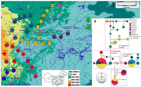 The sampling sites could be naturally divided into three regions, northwest, north, and southwest China, due to Qinling Mountain acting as an important geographic and climatic dividing line and thus a natural barrier to gene flow for most plant populations. Based on the distribution pattern of haplotypes in China observed above, we can conclude that haplotypes were relatively abundant in the northwest China (i.e., Shaanxi and Gansu provinces), while Chinese pepper accessions in north China had a relatively more simple haplotype composition. We also observed numerous regional specific haplotypes, including H15–H18 and H21–H28 that were specific to the northwest China, H19–H21 specific to the southwest China, and H2–H3, H8–H11, and H12–H14 unique to the north China (Figure 2A). These findings suggested limited inter-regional gene flow for Z. bungeanum species. However, we observed no apparent spatial genetic structure for variation of Z. armatum species due to its low number of haplotypes.