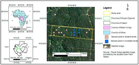 The oil palms were sampled in a plantation operated by the Société Olam Palm Gabon, which is located in the Makouké district, Moyen Ogooué Province, central Gabon. The region is characterized by a hot and humid equatorial climate, with two rainy seasons and two dry seasons. The plantation adjoins the Ogooué River, which is the largest river in Gabon. The temperatures in the area range from 27 °C to 38 °C and precipitation reaches 1800 to 2000 mm annually. The plantation is located on a ferralitic Cambisol-dominant soil. Established in 1981, it is the oldest plantation of oil palm in Gabon. It currently covers 5700 ha, with an average density of 134 oil palm trees per hectare. Mature oil palms represent an area of about 1500 ha. The plantation is divided into blocks. One of these blocks was the study area, located between longitudes 10°24′27′′ E and 10°24′57′′ E, and latitudes 0°30′06′′ S and 0°30′16′′ S (Figure 1). The block considered covered an area of 25 ha (1000 m × 250 m). The palm trees inside the block were mature and were planted in both dry and flooded areas (Figure 1).
