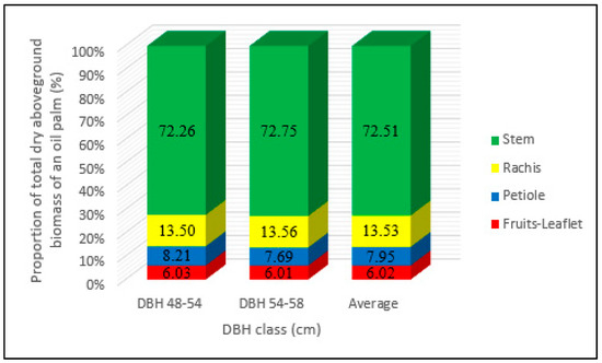 Average proportions are shown in Figure 2 for the aboveground oil palm biomass per compartment as a function of the DBH class. The aboveground biomass of the 18 oil palms that were sampled was concentrated mainly in the stems (72.51%). Leaf biomass (including petioles, rachises, fruits and leaflets) represented on average 27.50% of the total aboveground biomass. Average biomass proportions of rachises (13.53%) were much higher than those of petioles (7.95%) and fruits and leaflets (6.02%). The difference between the biomass proportions in each compartment by diameter class (48–54 cm vs. 54–58 cm) was analyzed by simple linear regression. Proportions did not significantly differ between the DBH classes (r2 = 0.999, p < 0.0001).