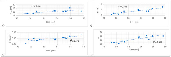 Before creating the biomass equations, we first examined the interrelationships between the variables under consideration. Clearly, the question was whether variation in ρ, HTOT, HT and NF could be explained by the diameter (DBH). As shown in Table 4 and Figure 3, the respective allometric relationships were significant (p < 0.05) between the dependent variables ρ, HTOT, HT and NF, vs. the independent variable DBH, with a moderate to strong r2 (0.538 to 0.806). The %RMSE was < 3% (Table 4). On the one hand, the strongest relationship was obtained between the stem height and the DBH (r2 = 0.806; p = 0.0001). On the other hand, the weakest relationship (albeit, statistically significant) with the DBH was obtained with the total tree height (r2 = 0.538; p = 0.010).