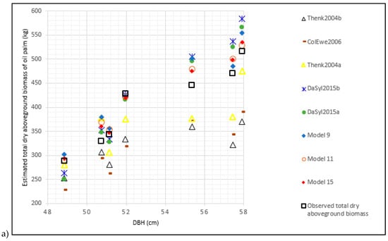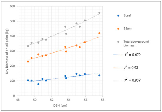 In this study, the stem diameter was measured at 1.3 m above the ground surface (DBH), consistent with other studies estimating the aboveground biomass of oil palms [22,23,27]. Several allometric relationships were established to estimate the oil palm biomass in this research (see Table 5).