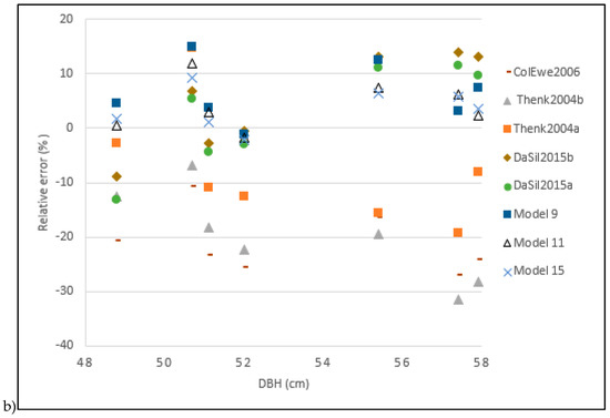 Comparison of the selected existing allometric models with the best allometric models that were proposed in this study: (a) biomass variation according to DBH; (b) relative error variation according to DBH.