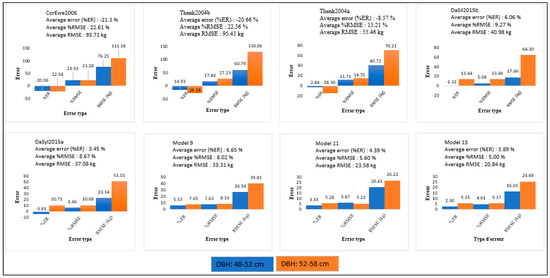 Errors in the allometric models when considering the two DBH classes (48–52 cm, 52–58 cm).
