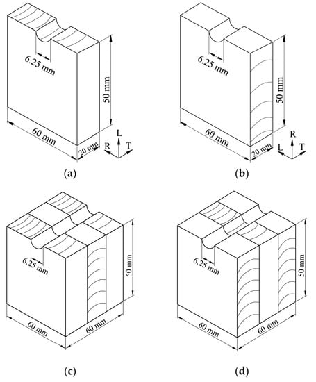 General configurations and detailed dimensions of half-hole bolt-bearing single wood species blocks loaded in longitudinal (a) and radial (b) directions, and CLT blocks loaded in longitudinal (c) and radial (d) directions, respectively.