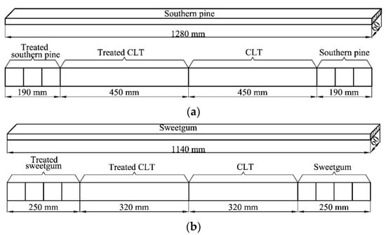 Cutting pattern of southern pine (a) and sweetgum (b) lumbers.