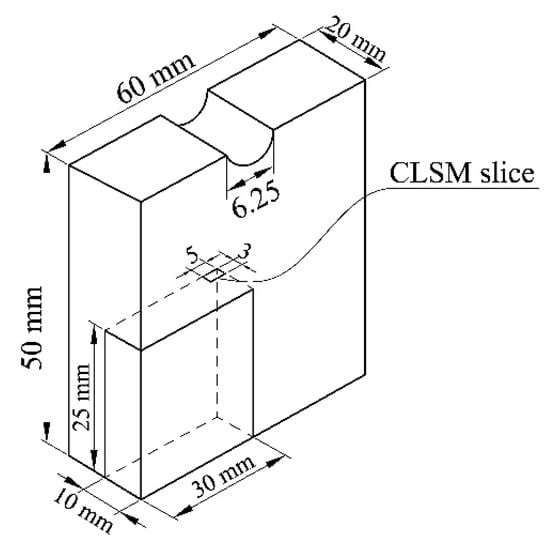 All treated blocks were impregnated with a low MWPF resin with a concentration of 20%. The low MWPF resin was obtained by diluting the low MWPF with 48.42% solid content (Table 3). The impregnation process started with vacuuming the pressure of the cylinder of a lab-made vacuum cylinder machine to −85 kPa and maintaining the vacuum for 15 min, followed by loading the low MWPF resin, elevating the cylinder air pressure to 690 kPa for 30 min, and then releasing the pressure to end the impregnation process. All blocks were weighted before and after impregnation. All control and treated blocks were first oven-dried for 24 h at a temperature of 80 °C, followed by another 24 h drying at 105 °C. The distributions of penetrated low MWPF resins in southern pine and sweetgum materials were observed by slicing 5 mm long × 3 mm wide × 20 µm thick pieces from the center cross section of treated blocks (Figure 4) using a pulley section slicer (KD-2558, KEDEE, Jackson, MS, USA) first, followed by taking images through a confocal laser-scanning microscope (LSM 510, Carl Zeiss Inc., German) with the magnification set to 100 µm.