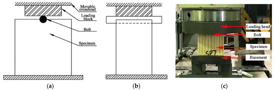 Setup for evaluating the half-hole bolt-bearing yield load of evaluated wood materials in this study: front view (a), side view (b), and photo of the setup (c).