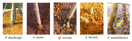 The stem bases (near water table) of all species under the waterlogging treatment before harvest. In species other than Pinus thunbergii, lenticels were observed near the stem bases under waterlogging. Fine roots and adventitious roots were also observed for Alnus hirsuta and Fraxinus mandshurica (shown with yellow arrows).
