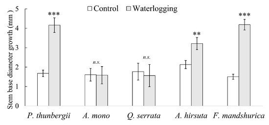 Means (±SE) of stem base diameter (mm) (n = 12, except for Quercus serrata where control was n = 5 and the waterlogging treatment was n = 4). Growth was obtained by subtracting the value before waterlogging treatment from the final value. White bars are results of the control treatment and gray bars are results of the waterlogging treatment. Results of one-way ANOVA are denoted as: **, p < 0.01; ***, p < 0.001.