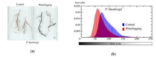 For control treatments, root color was generally close to light or dark brown for P. thunbergii, A. mono, Q. serrata and A. hirsuta, and for F. mandshurica it was white. Under waterlogging, a visible response was observed: root color darkened (Figure 3a). This change was most significant for P. thunbergii, where under waterlogging, the area ratio for darker fine roots (gray scale near < 50) increased (Figure 3b). For F. mandshurica, root color was white under both control conditions and waterlogging and only minor effects of waterlogging were observed. For A. mono, Q. serrata and A. hirsuta, the change in root color was not as evident as for P. thunbergii. Brightness histogram results of species other than P. thunbergii are shown in Appendix A Figure A1a–d.