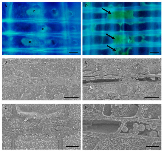 We used fluorescence microscopy and cryo-SEM to compare the morphology of the parenchyma cells in normal and freeze–thaw-treated samples. Fluorescence microscopic observation showed that the ray parenchyma cells in the normal samples had elliptical nuclei and granular contents in their cytoplasm, whereas those in the freeze–thaw-treated samples had no or deformed nuclei and some autofluorescent materials attached in the lumen (Figure 1A,D). Cryo-SEM observation further showed that the ray parenchyma cells in the normal samples had cellular contents with water, whereas those in the freeze–thaw-treated samples exhibited dehydration of the cytosol or the accumulation of broken materials in the cytosol (Figure 1B,C,E,F).