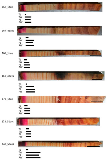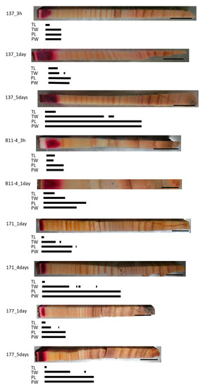 We investigated whether a lack of living parenchyma cells affected mineral movement in the trunk using freeze–thaw-treated trees. Analysis of the Cs detection area in the freeze–thaw-treated samples showed that the red staining of the acid fuchsin had spread radially through several annual rings from the outermost annual ring (Figure 2). The Cs peaks in the tracheid lumen (TL) were almost identical to the red-colored area in all samples. The Cs peaks in the cell wall between tracheids (TW), ray parenchyma cell lumen (PL), and cell wall of ray parenchyma cell (PW) were detected in almost the same area within a given sample and were further toward the inner xylem in samples that had been injected for 4 or 5 days compared with those that had been injected for 1 day within the same tree in all samples.