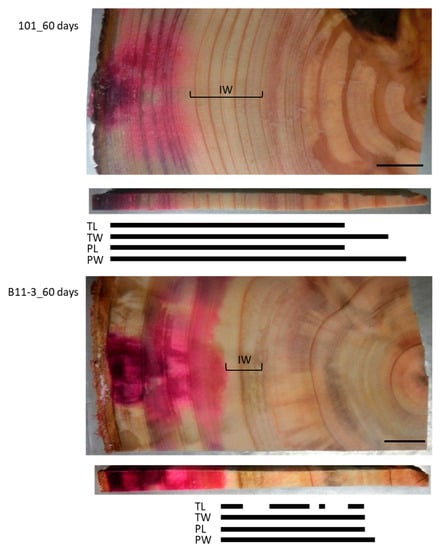 In this study, intermediate wood was defined as the zone inside the sapwood that developed an easily distinguishable white color under the frozen condition, as described in Kuroda et al. [16], and sapwood, intermediate wood, and heartwood were distinguished by color [14,20,21].