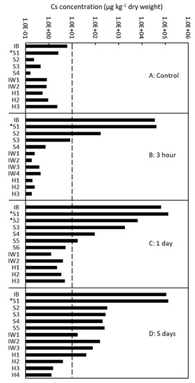 - Kuroda, K.; Kagawa, A.; Tonosaki, M. Radiocesium concentrations in the bark, sapwood and heartwood of three tree species collected at Fukushima forests half a year after the Fukushima Dai-ichi nuclear accident. J. Environ. Radioact. 2013, 122, 37–42. [Google Scholar] [CrossRef]