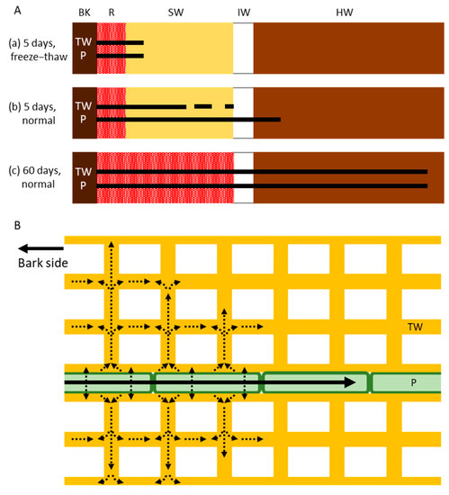 - Fujikawa, S.; Kuroda, K.; Jitsuyama, Y.; Sano, Y.; Ohtani, J. Freezing behavior of xylem ray parenchyma cells in softwood species with differences in the organization of cell walls. Protoplasma 1999, 206, 31–40. [Google Scholar] [CrossRef]