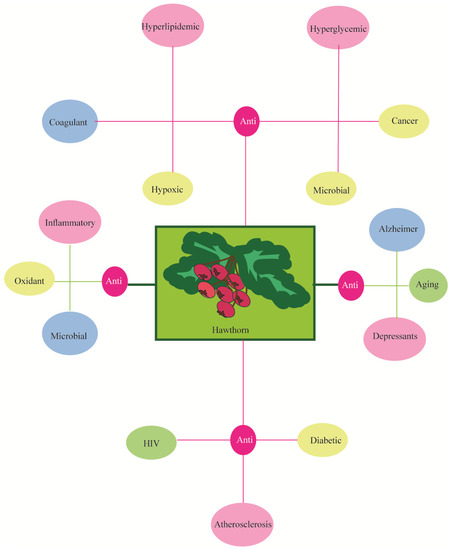 Medicinal wild plants and herbs have recently received increased interest worldwide since they are rich sources of bioactive compounds and for their potential beneficial health properties, which have often been well known for centuries [1,2,3,4,5,6,7,8,9,10,11,12,13,14,15,16,17,18]. The World Health Organization (WHO) reported that about 80% of the world’s population uses traditional drugs, including herbal medicine, for the treatment of diseases before considering conventional drugs when available [19]. One of these interesting popular medicinal plants is hawthorn (Crataegus spp.), a deciduous branched shrub/small tree that is twisted and thorny, belonging to the Rosaceae family and Maloideae sub-family. Hawthorn is present worldwide with about 280 species, among which the most common are: C. monogyna, C. laevigata, C. mexicana and C. douglasii, grown in Europe, North Africa, West Asia, and North America. The scientific name of hawthorn comes from the Greek word “kràtaigos” which means “strength and robustness” due to its hard and durable wood. Natural habitats of hawthorn are wooded and sunny areas on predominantly limestone soils up to 1500 m above sea level. This species is very rustic and is not very water demanding. C. monogyna has leaves that are 20–60 mm long with a rhomboidal shape that are deeply engraved and have notched lobes; the flowers are white/pink and form blooms of 5–35 units; the fruits are red berries of 10 mm when ripened, and contain one seed. Flowering takes place between April and May, and fruit ripening between September and October. Various parts of this plant—in particular, the berries, flowers, and leaves—are rich in nutrients, and have been traditionally associated with many health, medicinal or nutraceutical beneficial health effects [20], e.g., anti-microbial, anti-inflammatory, antioxidant, anti-cancer, and anticoagulant properties. Some of the most relevant properties associated to this plant are reported in Figure 1. According to its traditional use, and since it is generally recognized as safe (GRAS), the Committee for Herbal Medicinal Products of the European Medicines Agency classified hawthorn as a “traditional herbal medicinal product” [21,22]. This wild plant has been used as a traditional medicine, herbal drug, and food supplement for centuries [23,24]. According to the holistic and traditional approach, hawthorn leaves and flowers are used to prepare infusions that can be used to control palpitations, tachycardia, and nervousness. Away from meals, hawthorn has been used against hypertension and, before sleeping, for its relaxing and sedative actions. The berries promote cardiovascular health, protecting from angina, hypertension, heart failure, cardiac arrhythmias, myocarditis, arteriosclerosis, insomnia, and anxiety. Moreover, the berries are astringents and diuretics, and can act against diarrhea, urinary retention, and intestinal cramps. Indigenous peoples from Latin America use the berries for the preparation of a highly energetic drink called “Pennican”, and, in many parts of the world, the berries are used to prepare jams and as flavoring for dishes like white meats. Hawthorn, however, can also have a few collateral effects and contraindications; in particular, it is not recommended when blood pressure is low. Considering the multiple health properties of this medicinal wild herb, this review describes the potential use of hawthorn in therapy and as a support of some human health conditions.