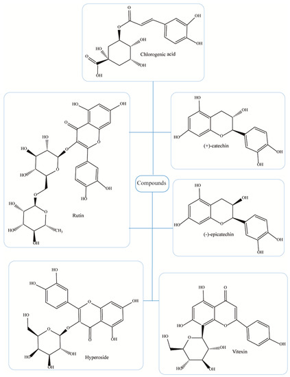 Chemical analysis has allowed for the identification of more than 150 bioactive molecules in hawthorn, including phenolic acids (ferulic, gallic, p-coumaric, syringic, chlorogenic, caffeic), quercetin, pyrocatechin, phlorodizin, terpenoids, lignans, steroids, organic acids (fumaric, tartaric, succinic, citric, malic), and sugars (maltose, sucrose, glucose, fructose). These are represented in Figure 2 [25,26].
