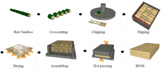 At present, bamboo scrimber, LBL and bamboo plywood have been widely used at home and abroad. However, bamboo scrimber and bamboo plywood have a low degree of automation in processing, and LBL suffers from low material utilization [11,12]. BOSL is defined as a composite of strand elements with bamboo fibers oriented primarily along the length of the member, and BOSL is an extension of the technology used to produce oriented strand boards (OSB) as structural panels [13]. The production process of BOSL, similar to that of OSB, has the advantages of high bamboo utilization, high degree of automation, small performance difference compared to sawn timber, and mass production [14,15,16,17]. Because of the high longitudinal strength of bamboo fibers, BOSL can also provide the most efficient section to resist axial forces and flexural loads parallel to oriented fibers [18]. The research on BOSL is still in the laboratory stage. Malanit et al. [19] concluded that the adhesive type and amount had significant influence on the performance of BOSL, and BOSL had better water resistance than pine-based oriented strand lumber (OSL). Sumardi et al. [20] found that the change of board type and strand length had a great effect on the flexural properties and internal bond strength of BOSL. Semple et al. [21] concluded that OSL prepared by mixing wood and bamboo strands had better water resistance than that prepared by wood strands alone. These studies also showed that the density and mechanical properties of BOSL were generally close to those of wood-based OSL, and BOSL had no obvious advantage of properties. In order to make full use of the high strength, and overcome the disadvantage of high density, of bamboo [22], further study is needed to improve the performance of BOSL and increase its product added value. According to the performance requirements of target products in different fields, designing BOSL with different properties would be an efficient approach to expanding the BOSL application field.