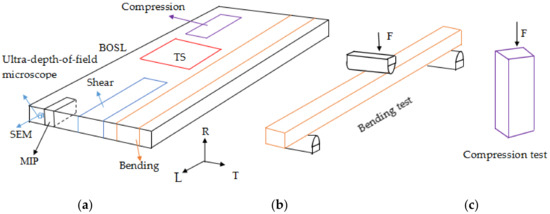 The modulus of rupture (MOR) and modulus of elasticity (MOE) of BOSLs were evaluated using three-point bending test (Figure 2b) according to GB17657-2013 standard. The samples with a dimension of 300 mm (L) × 20 mm (T) × 15 mm (R) were tested at a constant crosshead speed (8 mm/min) and the span of 260 mm.