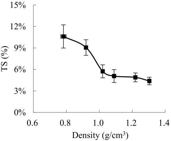 In this study, the target densities of BOSLs were 0.7, 0.8, 0.9, 1.0, 1.1 and 1.2 g/cm3, respectively, but the corresponding actual measured densities were 0.78, 0.92, 1.02, 1.09, 1.22, 1.3 g/cm3 (Figure 3), due to the influence of the preparation process. As seen in Figure 1, TS of BOSL decreases from 10.61% to 4.39% with increases in the density from 0.78 g/cm3 to 1.3 g/cm3. After 24 h immersion in water at 63 °C, even BOSL with a density of 0.78 g/cm3 had low TS—less than 11%. The density of specimens significantly influenced the water-resistance.