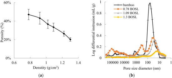 Correlations between BOSL density and porosity (a), and log differential intrusion versus pore diameter curves for bamboo and BOSL, with various density (b).
