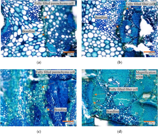 The specimens were sliced with a Leica RM2245 slicer to obtain a 4 mm long, 4 mm wide and 20 μm thick transverse section exposing a bondline. The specimen was sampled from the middle of the sample (Figure 2a). For better distinguishing the bamboo matrix and resins, the sections were stained with 0.5% fluorescent dye toluidine blue solution for 2–3 min, and then the dyed sections were dehydrated with two ethanol solutions: 75% and 100%. The distribution of PF resin in bamboo tissue was observed using an ultra-depth-of-field microscope.