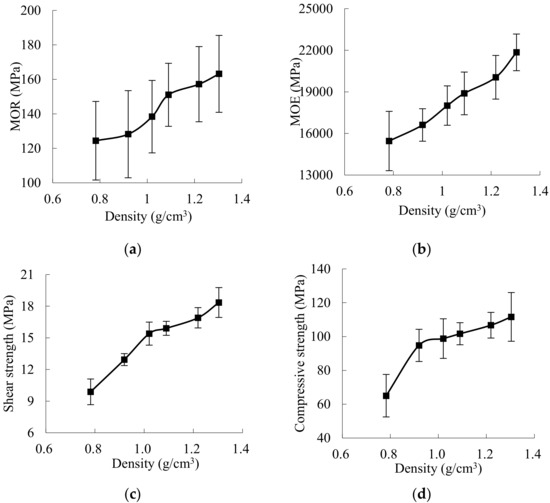 In this study, the change of density, from 0.78 g/cm3 to 1.3 g/cm3, caused the MOR and MOE of BOSL to increase by about 31.17% and 41.37%, respectively (Figure 4). With increases of the density from 0.78 g/cm3 to 1.09 g/cm3, the largest MOR increase was reported, increasing to 21%. As the density increased, the rise of MOE varied approximately linearly. The compressive strength and shear strength increased, by 71.69% and 88.36%, with the increase of density from 0.78 g/cm3 to 1.3 g/cm3, respectively. With the increase of density from 0.78 g/cm3 to 1.09 g/cm3, the increase of initial shear strength was the largest, and then the increase was slow. The shear strength was associated with bonding properties between layers when the material or component failed in shear. Resin content was also a key factor, causing a change of shear strength, besides the density itself [13,32].