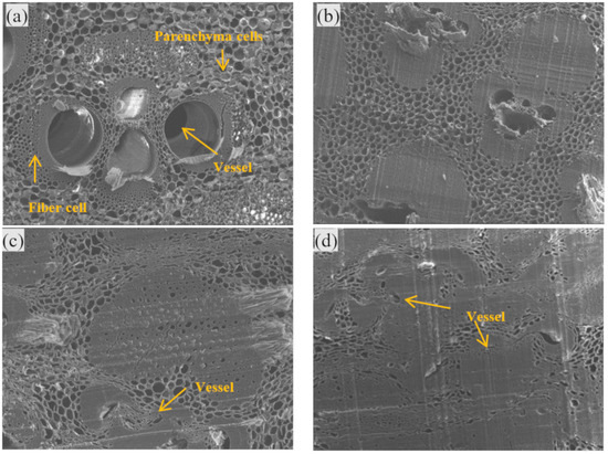 BOSL typically increased in strength with the increase of board density, which was in agreement with the conclusions of Mirski et al. [13] and Yu et al. [32]. The increasing strength of BOSL could be attributed to the reduced porosity and pore geometry. As BOSL was a kind of composite material, the porosity had influences on the distribution forms of stress [33]. Stress concentration occurred near the pores where the fracture initiated. Thus, high-density BOSL with fewer pores was not prone to damage, and showed better strength. Another reason may be the changes in the structure of BOSLs with different densities. As shown in Figure 5a, the bamboo tissue is dominated by vascular bundles embedded in a matrix of parenchyma cells. The vascular bundles were composed of vessels surrounded by fiber cells. After processing bamboo into BOSL with a density of 0.78 g/cm3, no significant structural changes occurred in parenchyma cells, vessels or fiber cells of bamboo (Figure 7b). Therefore, its strength was close to that of natural bamboo. However, with increases in the density, more parenchyma and vessel cells collapsed (Figure 7c,d) during the mechanical compression, meaning the gluing interface could be enhanced and the hydrogen bonding among the aligned fibers may be formed [1].This resulted in better mechanical properties of BOSL at higher density. In addition, the extruded and deformed parenchyma cells, vessels and parts of fiber cells made the volume fraction of elementary fibers increase in BOSL with higher density. The strength of fiber was much greater than that of parenchyma cells [34]. Therefore, the mechanical properties of BOSL were enhanced with the increase of fiber volume fraction. A similar conclusion has been illustrated by Yu [25], that increasing the volume fraction of fibers enhanced the strength of a bamboo fiber-reinforced composite.