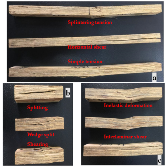 There were no obvious differences in failure modes of BOSL with different densities. The failure modes in the bending test were as follows (Figure 8a): The failure occurred at the tension faces of the specimens at mid-span, and the fractured surfaces included abrupt failure and “fibrous” failure, indicating a fracture showing splinters. The breakage of matrix and fiber could cause the flexural failure on the tension surface of specimens. The broken compressive surface could attribute to the buckling of specimens. In addition, longitudinal shear failures were also observed during bending test. Figure 8b shows compressive failures of BOSLs. It was generally one, or a combination, of the failure patterns, including shearing, splitting and inelastic buckling, which was possibly attributed to microbuckling surrounded by delamination. A similar failure was noted by Anuj Kumar et al. [35] and Li et al. [36] in the samples (along the longitudinal direction) of bamboo scrimber and wood scrimber. Figure 8c shows shear failure of BOSLs. The specimen subjected to loading in this test method not only produced the interlaminar shear failure in mid-plane, but also caused inelastic deformation. The severe shear-stress concentration, combined with transverse and in-plane compressive stresses, has been shown to be the cause of initiate failure. Specifically, there was a dense tissue in the outer part of the bamboo culm, so the resin was possibly incapable of deeper penetration. Beyond that, loose and fragile tissue in the inner part of the culm might inhibit surface attachment of the resin to the bamboo cells [20]. The glued joint of strands prepared from these parts was a weak spot, where severe stress concentration would probably appear, and this may be the cause of initiate failure.