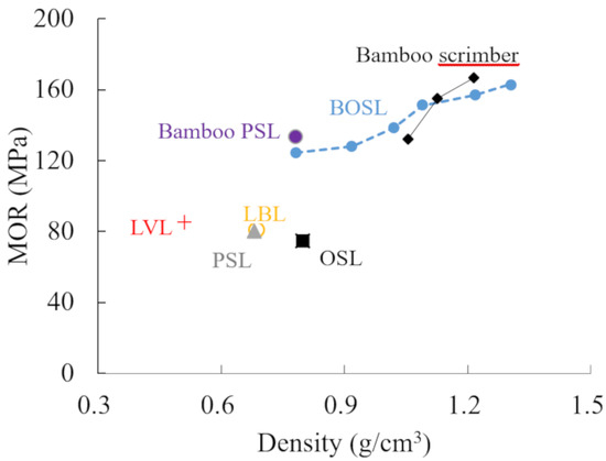 MOR comparison of BOSL with wood and other bamboo structural materials. MOR data of Parallel strand lumber (PSL), the data of bamboo-based PSL and Laminated veneer lumber (LVL) were from Anuj et al. [35] and Sharma et al. [37].