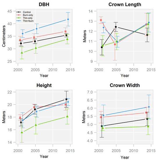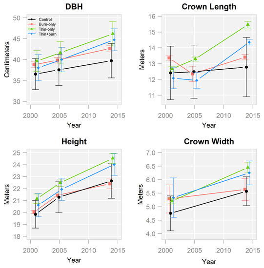 It should be noted that a number of studies have shown that thinning alone insufficiently reduces crown fire potential, though reduction of crown fire potential is the primary objective of fuel reduction treatments (e.g., [24,77,81,82]). This is because thinning alone does not treat dead surface fuels and can even increase loading, may not treat mid-story ladder fuels, does not increase crown base heights as well as burning, and increases in-stand wind speeds, depending on burn prescription. Furthermore, although a one-time low-severity fire may not impact the overstory tree characteristics examined in this study, it may confer increased resistance to disturbances through alternative, chemical pathways (e.g., [25]). We do not negate these findings, but seek to inform multiple-resource managers of the temporal effects of treatments on individual tree growth and attributes.