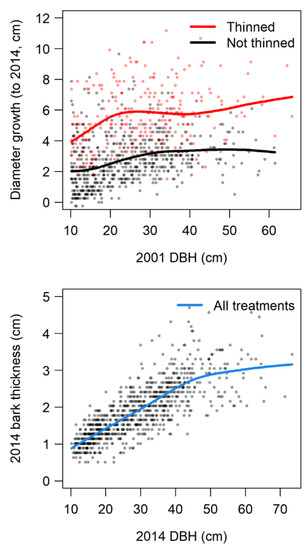 Bark thickness and resistance to cambial kill is dependent on both species and tree diameter [17,49]. Fuel reduction and restoration treatments are specifically designed to retain individual trees that have improved resistance (i.e., thick bark) to fire. For instance, Ryan and Reinhardt [49] found that the probability of fire-caused mortality in Douglas-fir with 1-cm-thick bark was 0.39 if 10% of crown volume was scorched by fire, and 0.98 if 30% was scorched; tree survivorship increased by 40% and 260%, respectively, for a tree with 3-cm-thick bark. Both our ponderosa pine and Douglas-fir bark thickness models corroborate that bark thickness increases with initial tree size. However, after controlling for differences in initial tree size, we found no additional effect of thinning or burning on bark thickness. This disturbance resistance model analysis masks that tree size increased more rapidly in thinning-based treatments, as identified in our tree growth models. Our study supports that thinning improves tree growth and that larger trees are associated with thicker bark (Figure 4). Thicker bark confers improved resistance to surface fire because it insulates stem cambium [50]; therefore, this study indirectly indicates that thinning-based fuel reduction treatment improves surface fire resistance. Land management agencies frequently look for metrics by which to monitor and evaluate tree and stand resistance to future fire. High average tree bark thickness is one metric that managers can use that is not only meaningful, but attainable with thinning-based fuel treatments via their positive effects on diameter distributions and tree growth.