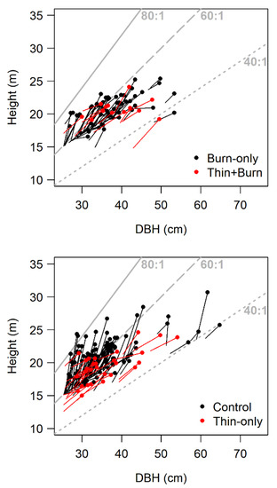 Douglas-fir periodic change in height and diameter relative to height-to-diameter ratio thresholds of 80:1, 60:1, and 40:1. Tree growth is represented from 2001 (segment terminus with no end cap) to 2014 (terminus with circle end cap). To better visualize the significant thinning effect, the top panel shows treatments that used prescribed fire, and the bottom panel shows treatments without prescribed fire.