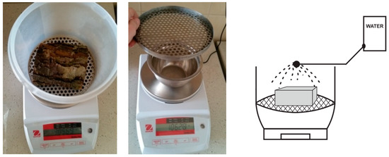 Water storage capacity (S) during simulated precipitation was measured by conducting a series of measurements at our unique measurement station (Figure 1). The measurement consisted of calculating the difference between the amount of water used to simulate precipitation (P) and the amount of water that remained on the wood sample. In order to show the dynamics of the water storage capacity of wood, readings of the amount of water retained by the sample were performed after spraying with subsequent doses of water (P1, P2, P3…) from a graduated container. The volume of a single dose was 20 mL. The delivery time for one dose of water was 30 s, so a total of five minutes of precipitation was obtained. The amount of water supplied to the wood sample was related to its surface, which was 0.0049 m2, resulting from the dimensions of the sample used for the analyses. The water layer unit per square meter [L/m2] was obtained in this way. The next doses of precipitation were a multiple of 4.08 mm of water (0.02 L/0.0049 m2). Distilled water with a temperature of 21 °C ± 1 °C was used to simulate precipitation. In the laboratory in which the experiment was conducted, the temperature was maintained at 21 °C–22 °C. An unchanging temperature was necessary due to the change of water density depending on the temperature [37]. The surface of the container above which the measurement was taken amounted to 200.96 cm2. The sprinkling of the sample with the total dose of water equal to 20 mL lasted for five minutes, which made it possible to simulate precipitation with a constant intensity of 12 mm/h. The analyzed wood sample was lying on a perforated pad, and the balance was tared so that the readings only indicated increments of the water that did not stop on the sample (ΔS).