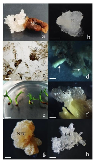 - Gao, F.; Shen, H.L.; Liu, C.P.; Wang, Y.; Zhang, P.; Yang, L. Optimization of culture conditions and selection of suitable explants for callus induction from mature embryo of Pinus koraiensis. J. Nanjing For. Univ. 2016, 41, 43–50. [Google Scholar]