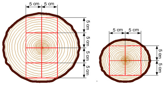 Logs 3 meters long were cut from each model tree: in total, 39 pine logs with a mean DBH of 15.2–25.7 cm, and 37 spruce logs with a mean DBH of 16.4–23 cm were cut. To prepare the wood samples (hereafter, samples) the logs were cut following this scheme: first, starting from the tree base, two logs 1–1.1 meters long were cut, and, second, the samples were prepared according to the scheme in Figure 1. In total, 275 samples were prepared for pine and 310 samples were prepared for spruce.