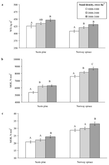 There were statistically significant differences in the characteristics of the wood between various stand densities. A significant effect of stand density on MOE and MOR of Scots pine and Norway spruce was found, i.e., the lowest MOE and MOR were observed at the lowest stand density. Few studies are available on the impact of thinning or stand density on MOE or MOR. However, in line with our results, ambivalent results were observed for MOE and MOR of other species. These wood mechanical properties significantly decreased in Sitka spruce influenced by early thinning [44] and in Douglas fir and Norway spruce with thinning [42]. However, in black spruce (Picea mariana), MOE slightly increased, but no changes of MOR values after thinning were reported [43]. No changes in both the MOE and MOR of loblolly pine [45] and no decrease in the MOE of Douglas fir [46] with varying silvicultural intensity were reported. However, both MOE and MOR increased in Sitka spruce [42]. According to Stöd et al. [28], the first thinnings provided saw timber with the lowest MOR and MOE, whereas the material from the second thinnings provided the higher values.