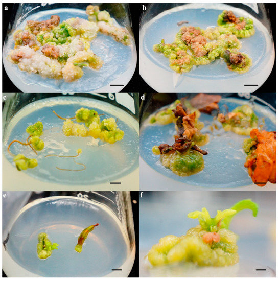 Hypocotyl, root and cotyledon-induced callus and hypocotyl regeneration buds. (a) Hypocotyls induced callus in a12 medium for 20 d (scale 5 mm); (b) Hypocotyls induced callus in a20 medium for 20 d; (c) Root callus induced in a20 medium; (d) Cotyledons induced callus in a4 medium; (e) Hypocotyls induced adventitious buds in a4 medium for 30 d (scale 5 mm); (f) Hypocotyls induced adventitious buds in a20 medium for 30 d (scale 2 mm).