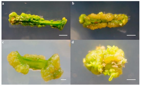 The experimental results showed that, at the same TDZ concentration, when 0–8 mg/L 6-BA was added, the higher the concentration of 6-BA, the looser the callus. However, when the adventitious buds induced by cotyledons were used as explants, a higher concentration of 6-BA did not contribute to the formation of a cotyledon callus [23]. The texture of the callus formed by the low-concentration 6-BA-induced material was dense and opaque green, and the texture surface of the callus formed by the high-concentration 6-BA-induced material was relatively loose and emerald green (Figure 1a,b). The callus formed by the hypocotyl was rigid (Figure 1d). At the same 6-BA concentration, with an increase in TDZ concentration, the callus induction rate increased, indicating that TDZ plays a key role in hypocotyl callus induction. This is consistent with the results of Zeng et al., who found that the frequency of bud organ development of explants cultured with TDZ (71.16%) is far higher than that of explants cultured without TDZ (30.42%) [24]. Internal callus tissue began to age and darken after 30 days of culture, and did not contribute to the formation of adventitious buds. In addition, callus induced by using roots as explants was milky white in the lower culture and yellow-green in the upper culture. After subculture, the internal callus was obviously browned, while the external callus could not produce a primordium structure and adventitious buds (Figure 1c). The callus formed by cotyledons has the characteristics of harder and slower growth, and the callus formed by roots has the characteristics of loose and fast growth. This may be why the cotyledons and roots failed to induce adventitious buds.