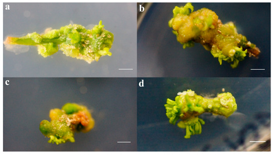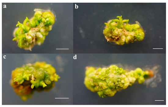 Adventitious buds induced by the addition of different concentrations of TSA. (a) Adding 0.15 mg/L TSA; (b) Adding 0.3 mg/L TSA; (c) Adding 0.6 mg/L TSA; (d) Adding 1.2 mg/L TSA (scale is 2 mm).