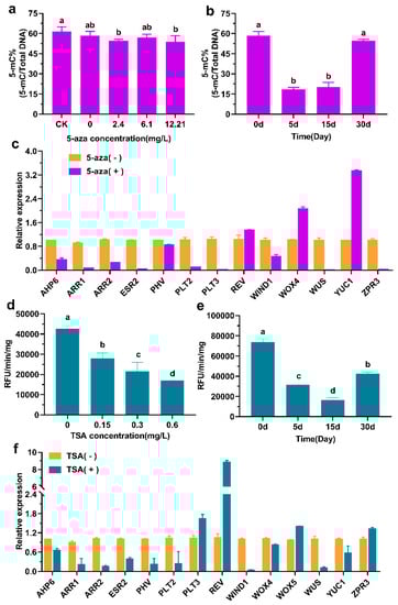 Epigenetic and related gene expression levels during stem bud regeneration. (a) The 5-aza concentration affects the 5-mC level of shoot bud regeneration during 30 d of culture. (b) Changes in DNA methylation levels at various stages of regeneration of the Fraxinus mandshurica Rupr. (c) 5-aza affects the expression level of regenerative bud-related genes in stem segments. (d) The TSA concentration affects the level of regenerated bud HDAC in shoots of stem segments during 30 d of culture. (e) TSA affects the change in HDAC activity during regeneration. (f) TSA affects the expression level of regenerative bud-related genes in stem segments. Different letters above bars within statistically significant differences between different times of the treatments at the p < 0.05 level according to Duncan’s multiple range test.