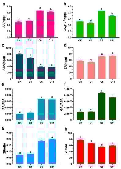 Samples were ground to a fine powder in liquid nitrogen with a mortar and pestle, and suspended in potassium phosphate buffer (50 mM, pH = 7.4). After vigorous shaking, they were centrifuged for 30 min at 8000 rpm at 4 °C. Endogenous hormones were extracted from plant extract samples using Mlbio enzyme-linked bio-plant gibberellin (GA3), zeatin nucleoside (ZR), abscisic acid (ABA) and indole acetic acid (IAA) enzyme-linked immunosorbent assay (ELISA) kits. For the determination, three biological replicates were set for each sampling point and three technical replicates were set. Specific methods were as follows: loading, enzyme, incubated with a solution, washed, color, termination, and measurement.
