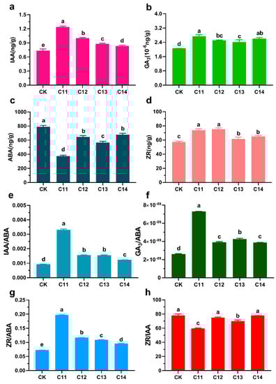 Effect of 6-BA on endogenous hormone levels in regeneration of F. mandshurica. (a–d) CK was the stem tissue, and C11, C12, C13 and C14 were the four endogenous hormones measured under the same culture conditions, and the 6-BA concentrations were 0, 5, 6 and 7 mg/L for 30 d. (e–h) The relative amount of endogenous hormones. Different letters above bars within statistically significant differences between different times of the treatments at the p < 0.05 level according to Duncan’s multiple range test.