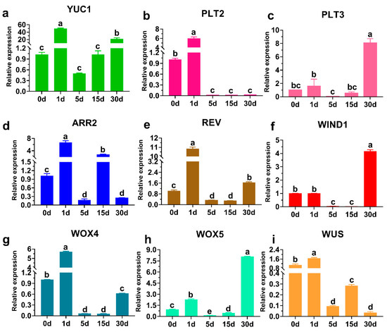 Gene expression of adventitious buds in the stem segments of F. mandshurica. (a–i) 0–15 d was used to induce callus in the dark culture stage. After 15–30 d, it was transferred to the light culture stage to induce callus regeneration, and the shoot regeneration time was 30 d. Different letters above bars within statistically significant differences between different times of the treatments at the p < 0.05 level according to Duncan’s multiple range test.