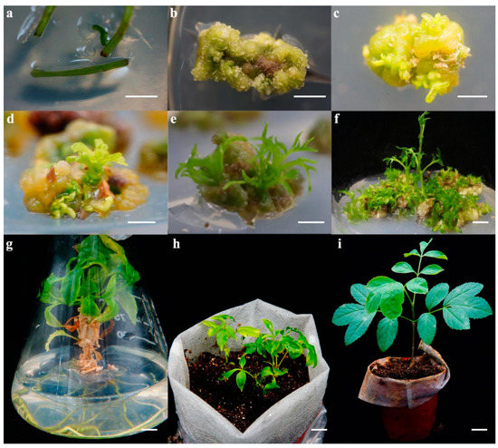Preliminary establishment of the callus regeneration system of stems of F. mandshurica. (a) Inoculation of stem explants (scale 5 mm); (b) Callus formed at 20 d; (c) at 30 d, young adventitious buds form; (d) at 40 d, clustered buds formed; (e) Adventitious bud elongation; (f) Sub-generation expansion; (g) Rooting (scale 5 mm); (h) Planting (scale 1 cm); (i) Sterilization of sterile F. mandshurica seedlings to survive (scale 3 cm).