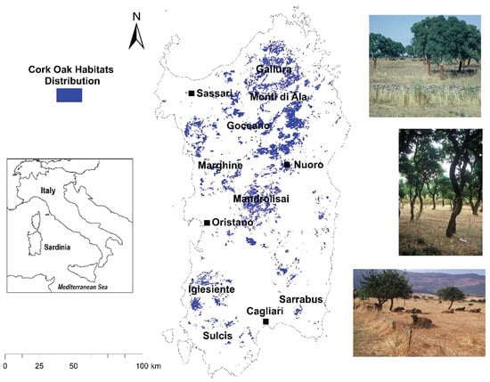 In Sardinia, Quercus suber is mainly limited by precipitation and soils with nuclei of distribution from north to south in the areas of Gallura, Monti di Ala, Marghine and Goceano, Madrolisai, Iglesiente, Sulcis, and Sarrabus (Figure 1). In general, the species is neither drought- nor frost-tolerant. The distribution is confined by ca. 600 mm of annual rain and optimum temperature 16–19 °C, mainly siliceous substrates with good water availability, while only rarely can it be found on limestone []. Most extensive cork oak habitats are found in the range of 300–600 m, although the species can also be found above 600 m and in some places up to 1000 m. There are many diverse cork oak habitat types, including even and uneven mixed forests and wooded pastures where Quercus suber can be the dominant tree or as a mixture with, for example, Quercus ilex and Olea europea. According to the land use map for Sardinia [] where cork oak forests (pure stands with cover > 25%) were mapped separately, the area covered amounts to 84,700 ha, while according to [], this figure was up to 119,500 ha in the past. Cork oak forests are identified as a distinct habitat type (9330) according to the European Habitats Directive and include west-Mediterranean silicicolous forests dominated by Q. suber with various subtypes usually in mixture with other species. In Sardinia, there are 24 Natura 2000 sites (c.f. Habitats Directive) where this habitat type can be found.
