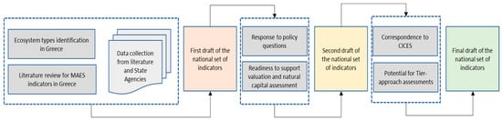 Moreover, each indicator is selected and tagged on the basis of its potential for application at the different tier assessments, i.e., tier 1 approach relies on widely available data and can be used to provide a rough overview of ES, tier 2 approach includes more specific information for the case study area, while tier 3 is the most data- and resource-demanding approach and is appropriate for large-scale and highly detailed assessments [13,17]. The steps followed to draft the final set of MAES indicators are presented in Figure 1.