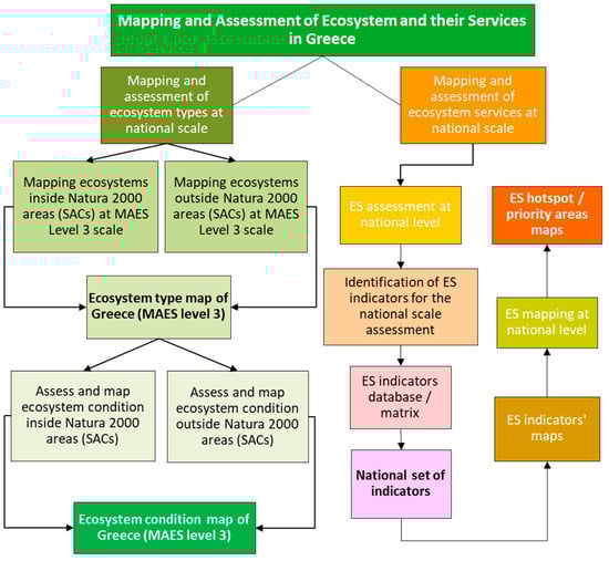 Reaching the end of the European Union (EU) Biodiversity Strategy to 2020 [1], and seven years after the publication of the multi-cited master document for Mapping and Assessment of Ecosystem and their Services (MAES) in the EU [2], many EU Member States (MS) have developed methods (e.g., References [3,4,5,6,7]) and conducted case studies (e.g., References [8,9,10]) towards the implementation of Action 5 of Target 2 of the EU Biodiversity Strategy. From 2015 to 2018, the Horizon 2020 Coordination and Support Action, ESMERALDA (Enhancing ecoSysteM sERvices mApping for poLicy and Decision mAking), aimed at developing guidance and a flexible methodology to support the EU member states in the MAES implementation; more specifically, the main objective of ESMERALDA was to provide guidance for integrated mapping and assessment of ecosystem services (ES) that can be used for sustainable decision-making in policy, business, society, practice and science at EU, national and regional levels [11,12]. In parallel, a collection of papers by Burkhard and Maes [13] provides a comprehensive guidance for MAES implementation and in combination with the ever-updating MAES Explorer online [14,15], that supports ecosystem ES research and proposes systematic ways of assessment, mapping and reporting for biophysical, economic and social aspects of ES applications (as well as for their possible wider integration). Furthermore, an operational framework for integrated MAES, developed by Burkhard et al. [16], builds on the MAES common assessment framework [2] and re-organizes it on the basis of specific, practical steps needed to be followed to ensure an integrated result, at EU and national levels.